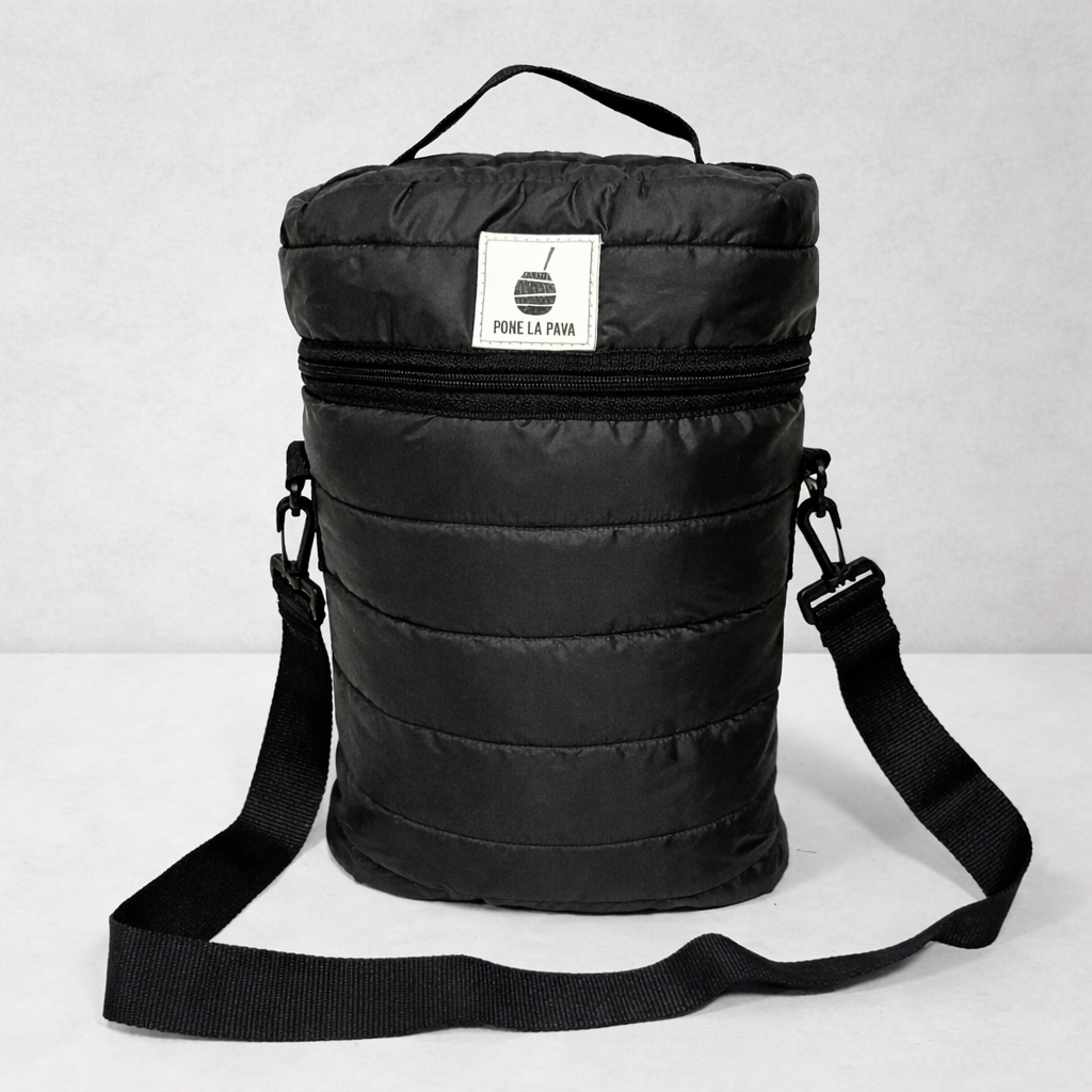 Cuenta con una correa larga que te permite llevarlo colgado recto o cruzado; también podes llevarlo en la mano por su manija sobre la tapa.