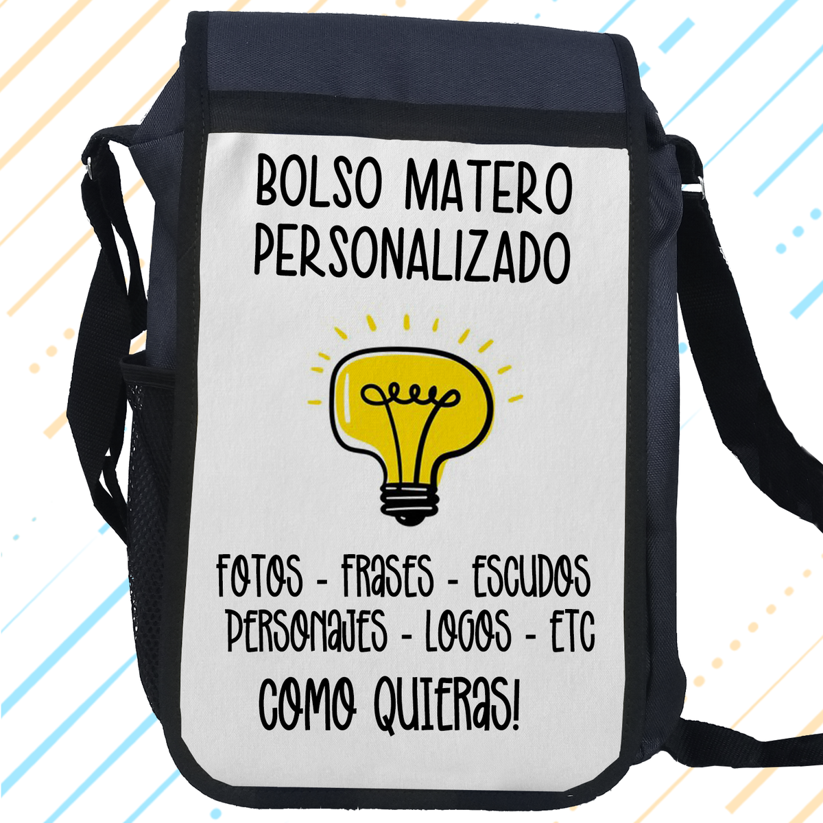 Bolso Matero realizado en cordura negra con correas regulables, diseño sublimado en solapa.