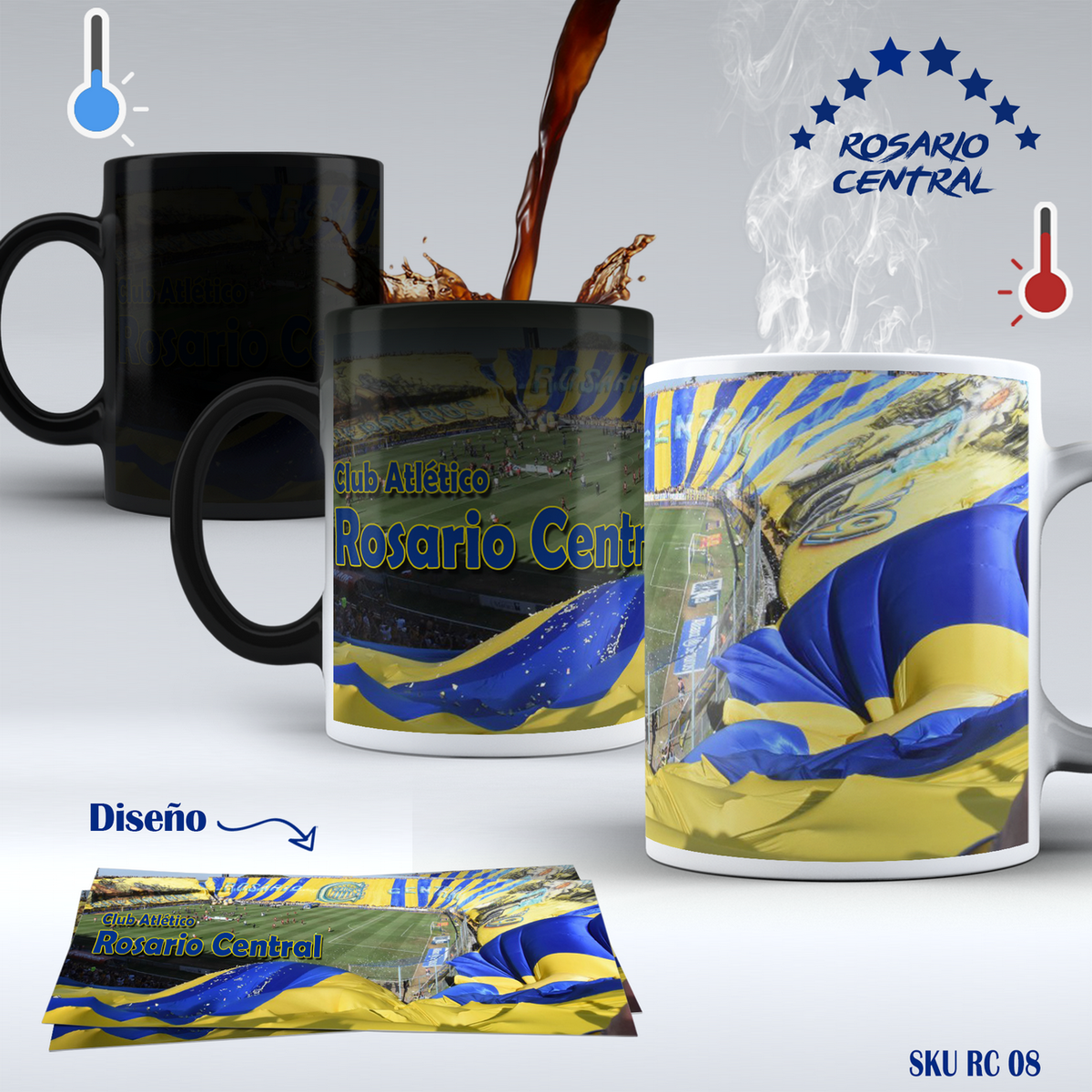 En frío la taza se encuentra de color negro, dejando ver a trasluz que tiene algo estampado. Luego al entrar en contacto con agua/infusión caliente, este barniz desaparece y la taza cambia de color y deja ver el estampado en su totalidad.