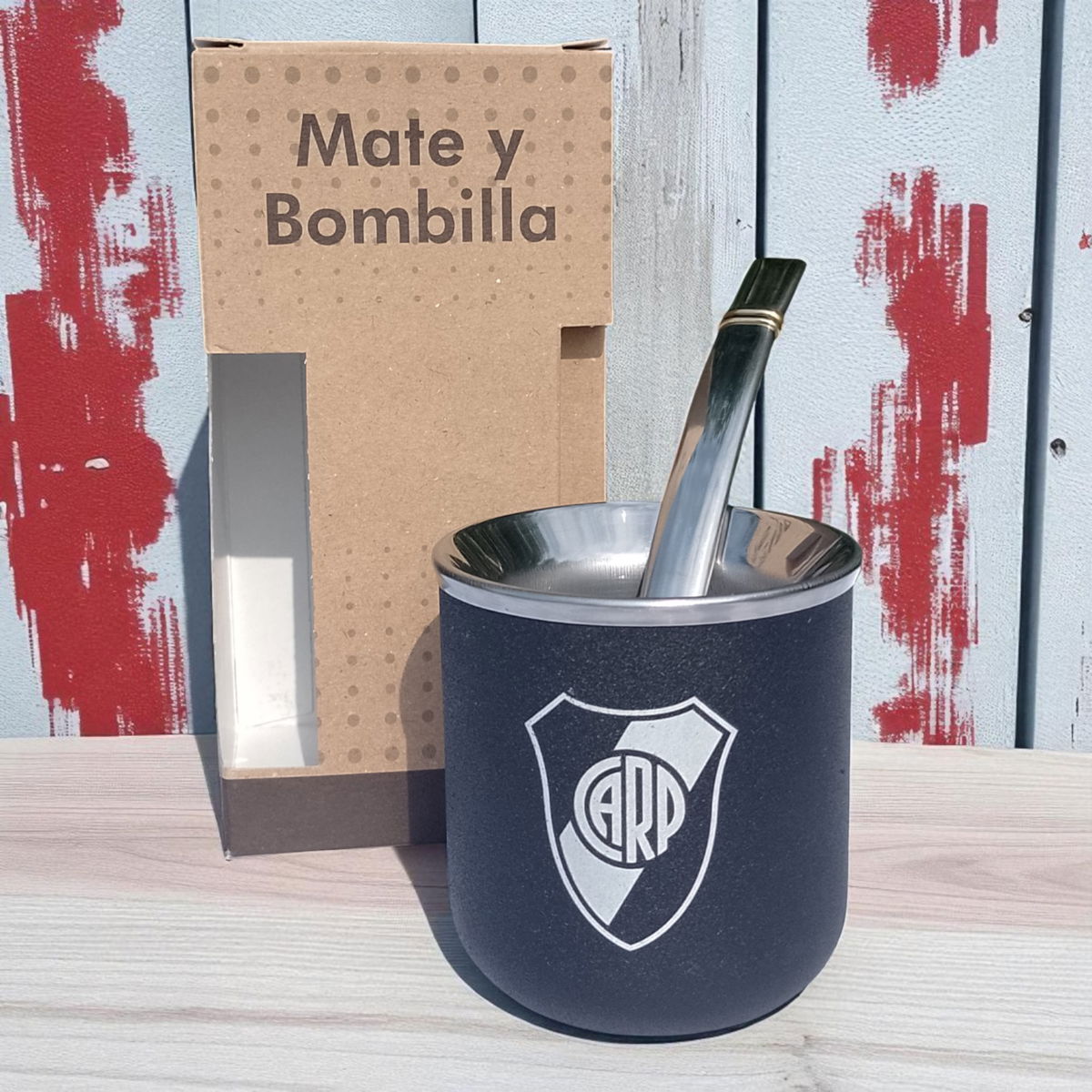 Mate de Acero Inoxidable River Plate con bombilla .